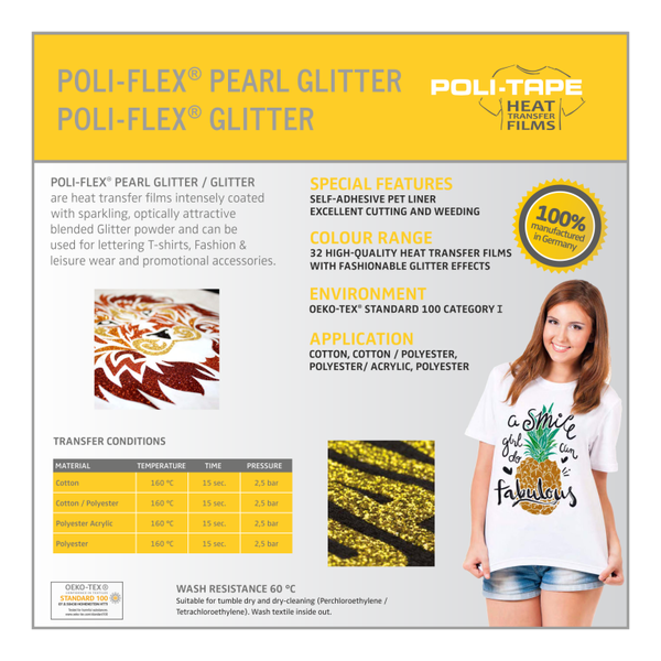 De Poli-Flex Pearl Glitter is een flexfolie met een sprankelend effect. Hiermee maak je blinkende creaties op verschillende soorten textiel. De flexfolie is vrij van PVC en de folie is te wassen op maar liefst 60 graden. Wil je graag een gepersonaliseerd rompertje voor een klein prinsesje maken of bedruk je liever een shiny tas voor jezelf? Het kan allemaal met de Poli-Flex Pearl Glitter!