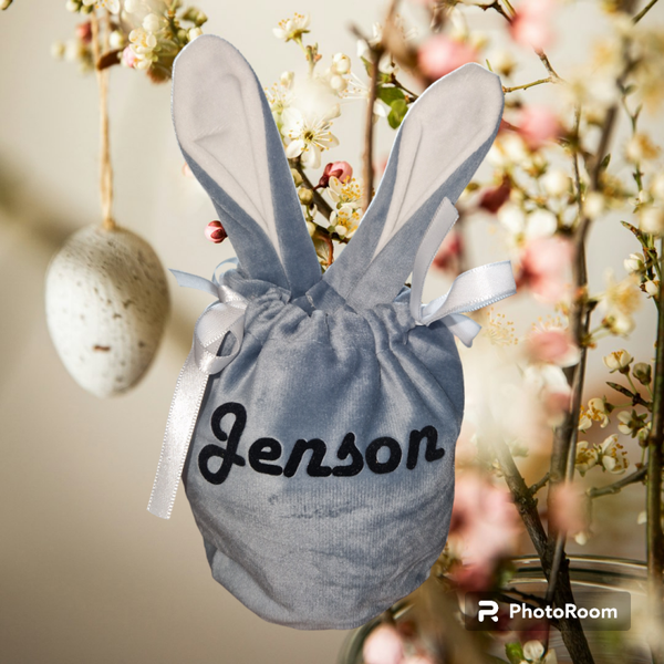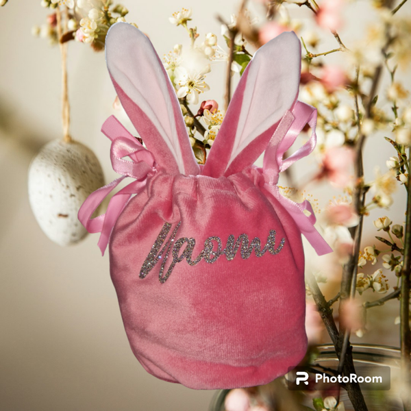 Een leuk velours look tasje met oren van de paashaas. Te sluiten met een lint. Luxe uitstraling. Gepersonaliseerd met naam.