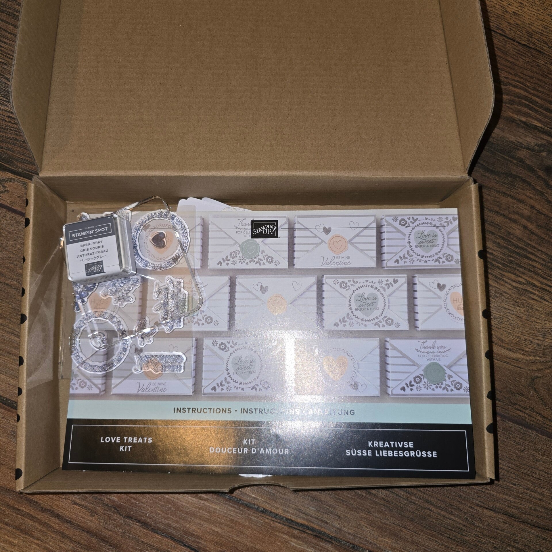 Creatieve set inclusief stempels, inkt en acrylblok voor het maken van kleine cadeaudoosjes.